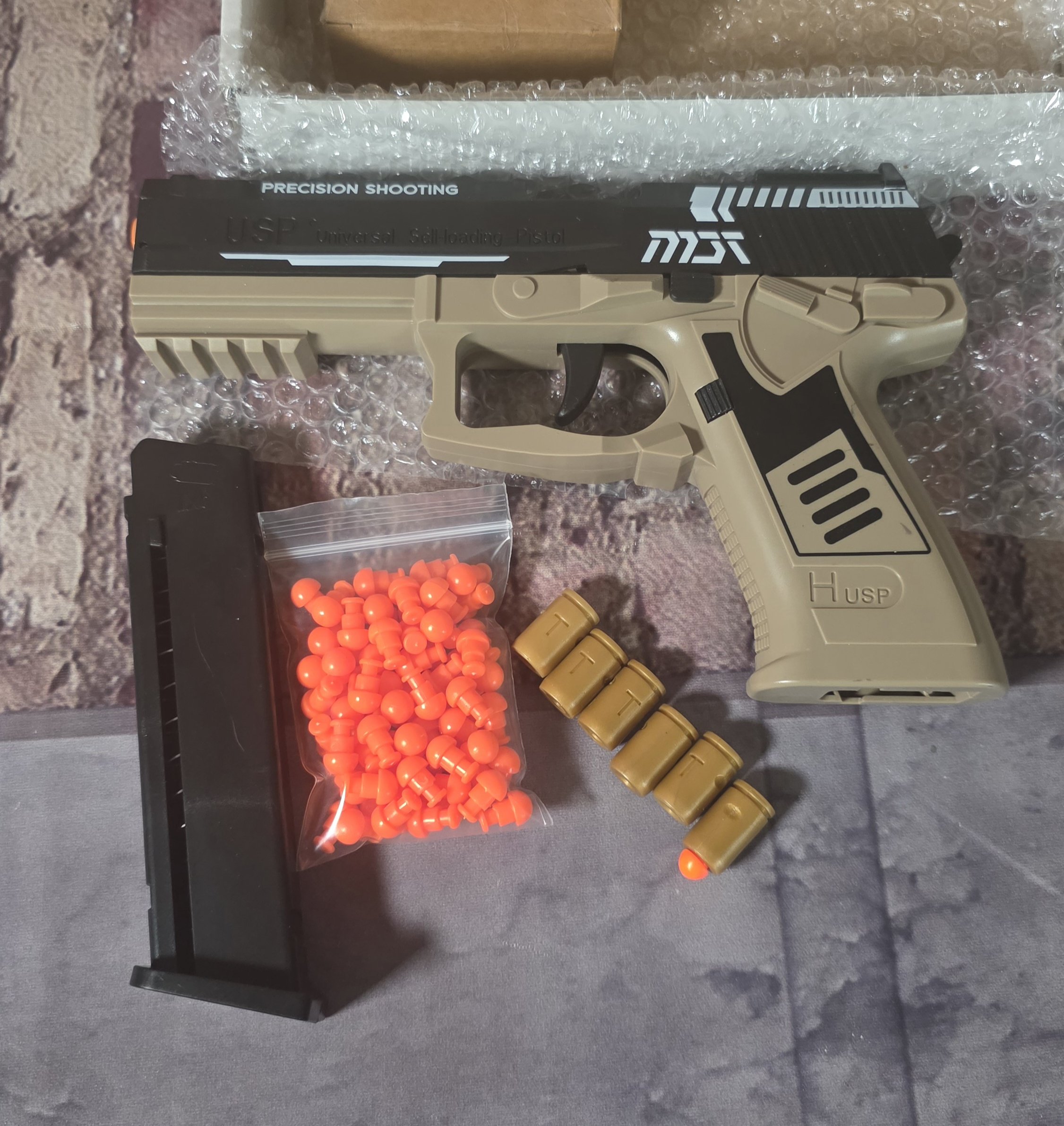 PACKAGE INCLUDES — 1 x Automatic Toys Guns + 1 x Magazines + 6 x Shells + 70 x Rubber Bullets, Creative improvement point — It can be fired continuously and automatically reloaded, The toy gun with soft bullets is specially designed for children, safe to play with without harm, Very cool and classic design, every child will like shell ejecting toy gun, it will surprise your child.