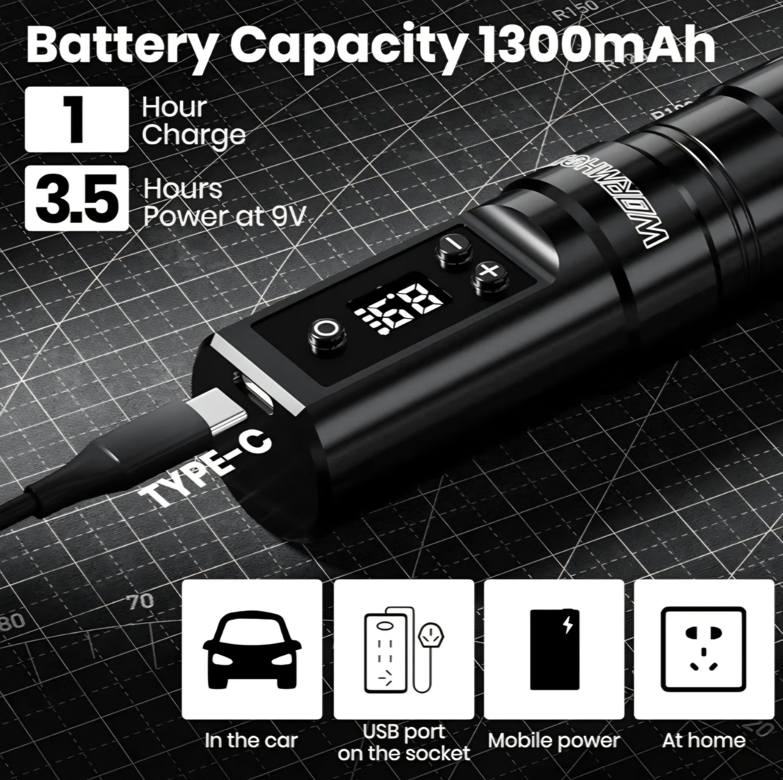 - 1300MAH Battery Pack: This wireless tattoo pen has a 1300mAh battery capacity, Type-C charging; the tattoo pen takes about 1 h to fully charge and can work for about 3.5 h at 9V; The cordless battery tattoo machine is designed to make it more convenient to carry when you go out for tattoo work