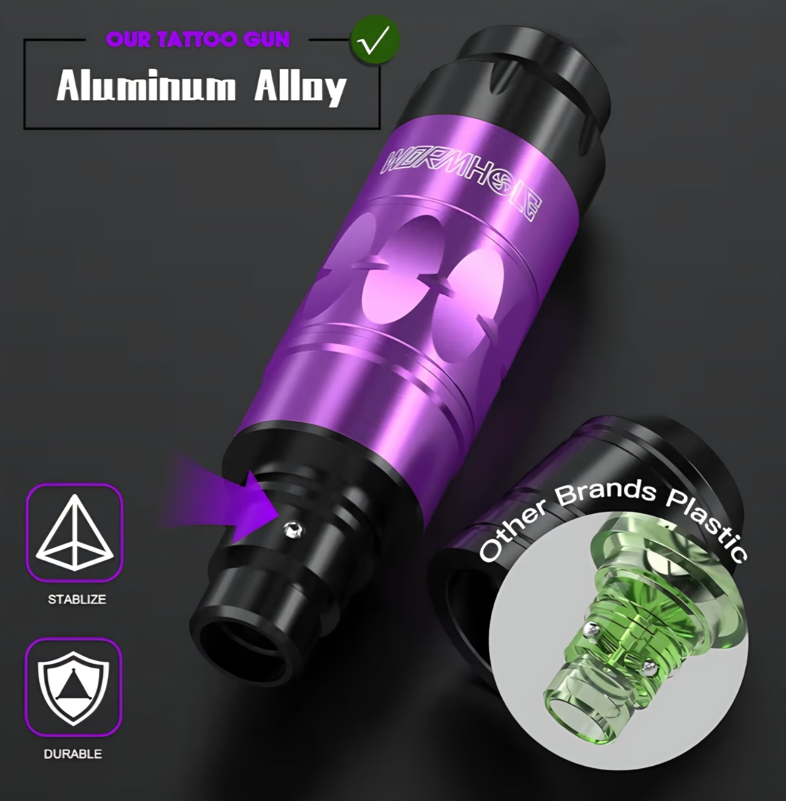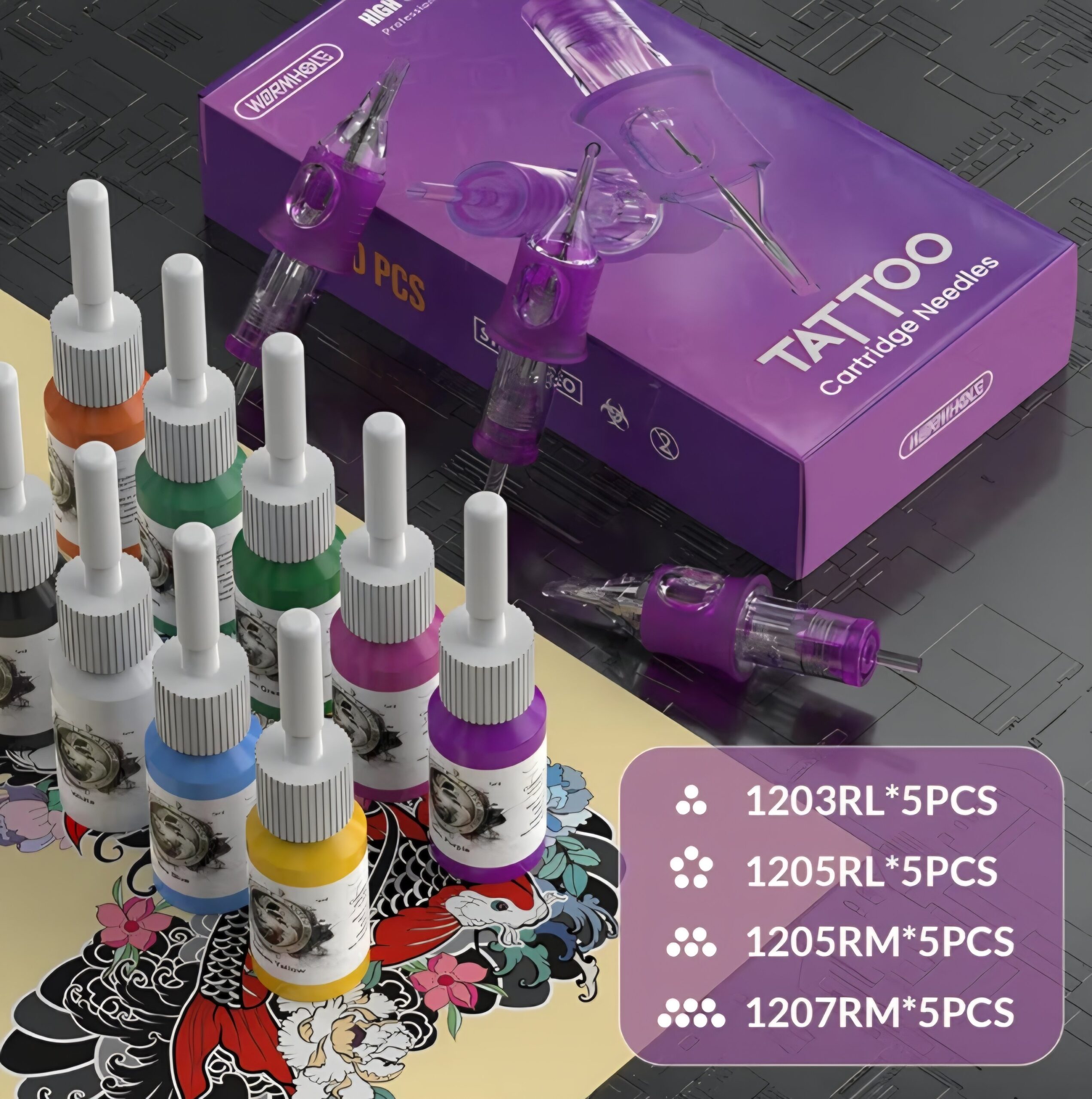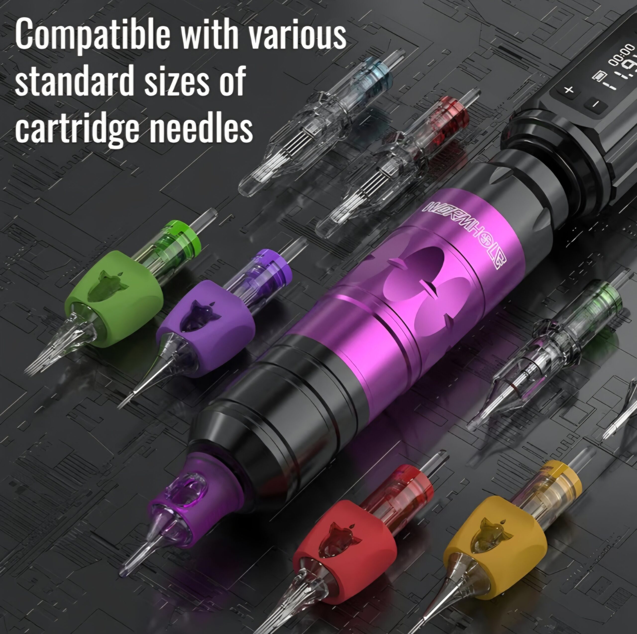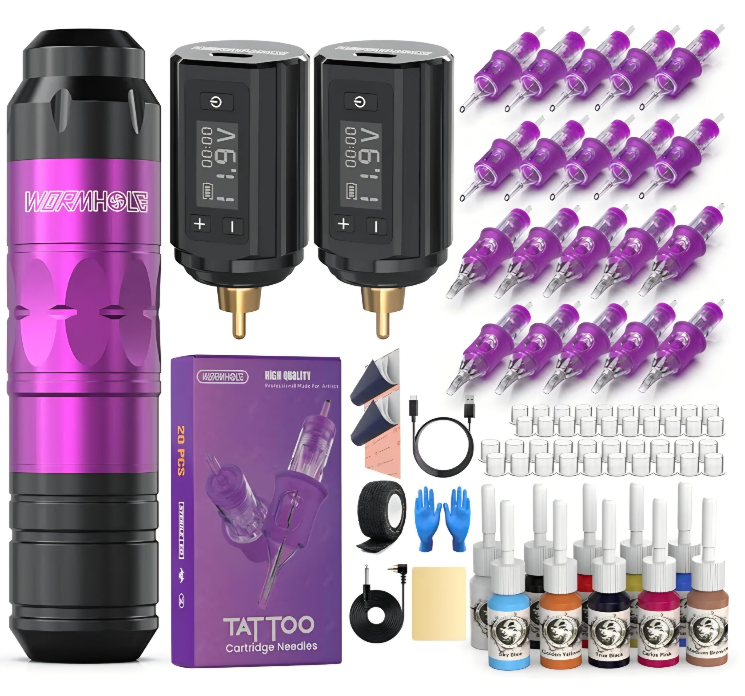 - PACKAGE INCLUDE: Complete tattoo practice kit of 81PCS featuring 1 Wormhole aluminum alloy wireless tattoo machine, 2PCS 1,200mAh capacity tattoo batteries, 20 tattoo cartridge needles with finger ledge, a vibrant tattoo ink color set, and other tattoo accessories for artists